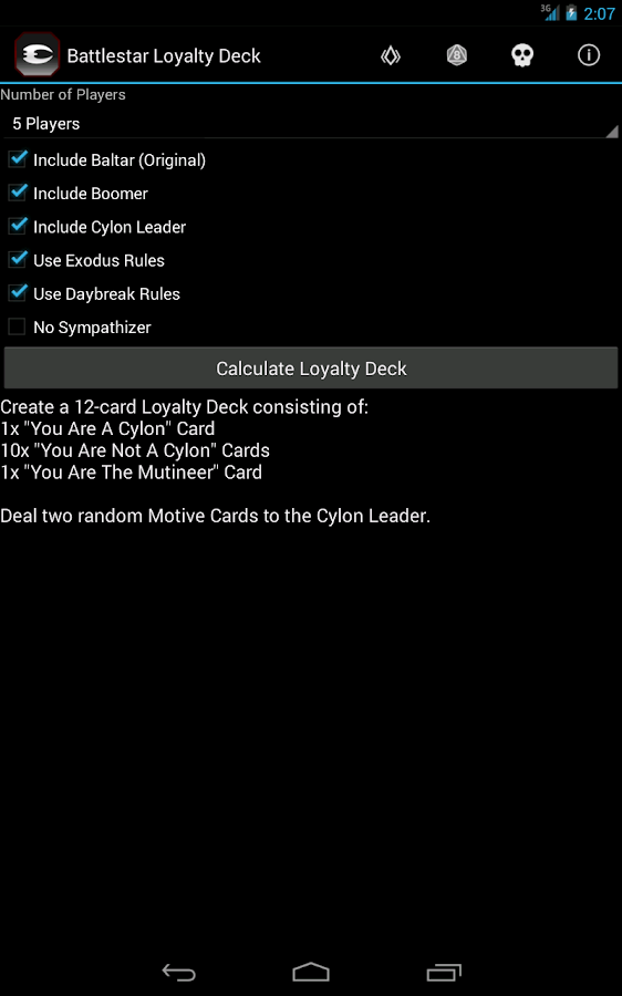 Se trata de una aplicación que nos permite crear el mazo de cartas de lealtad de forma mucho más agil. Para el juego básico de BSG quizás no sea tan útil, pero dado que en las tres expansiones existentes hay varios condicionantes que lo modifican bastante, es una ayuda muy agradecida, porque rebuscar en 4 manuales a la vez qué cartas hay que incluir, y cuales no, es un poco engorroso.